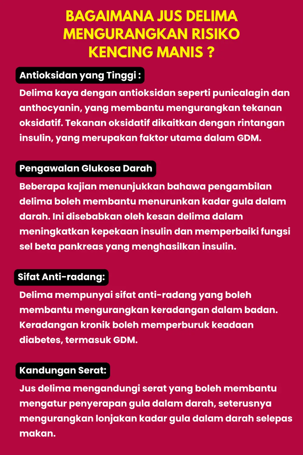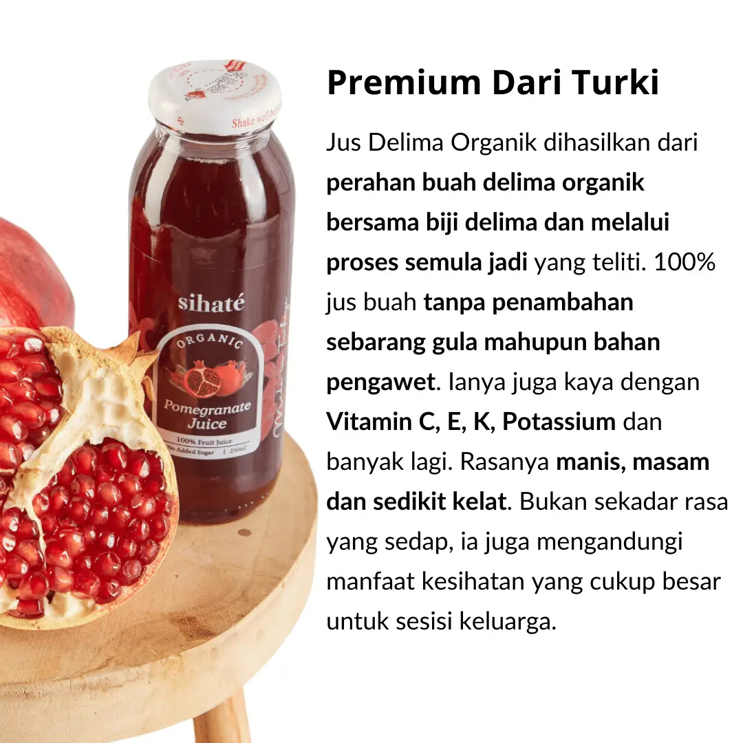 Gula yang terhasil di dalam jus ini merupakan gula semulajadi dari asal buah delima dan bukannya penambahan gula luar. Anda akan dapat menikmati rasa sebenar jus ini.