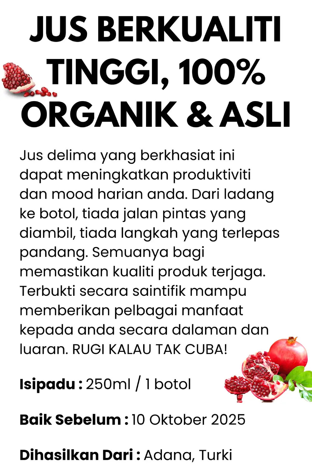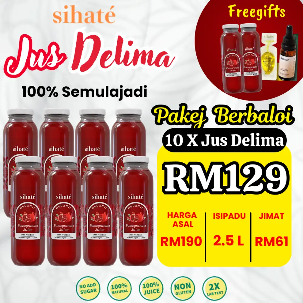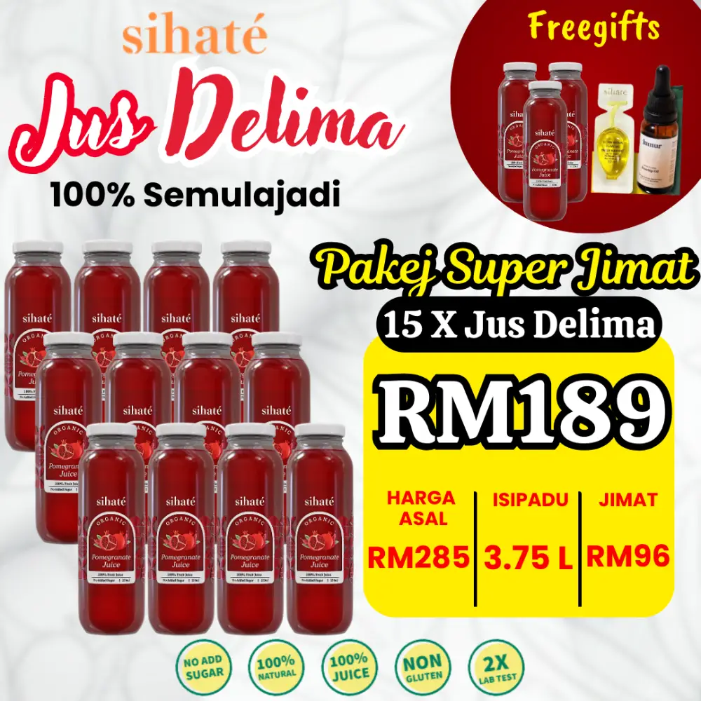 Gula yang terhasil di dalam jus ini merupakan gula semulajadi dari asal buah delima dan bukannya penambahan gula luar. Anda akan dapat menikmati rasa sebenar jus ini.